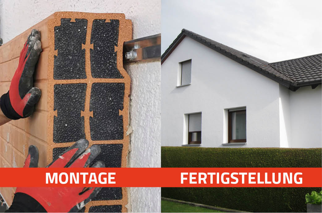Die Montage des ZMK-Fassadenelementes erfolgt mittels Schienen direkt auf die vorhandene Außenwand. Die Bestandswand muss in der Regel nicht vorbereitet werden, kein Egalisieren oder Entfernen von Putz. Die Befestigung erfolgt zeilenförmig alle 50 cm mittels Profilschiene. Das ZMK-Fassadenelement wird in die Schiene eingehängt und zur vorhergehenden Ziegelreihe verklebt. Zur Aufnahme von Windsog und -druckkräften sowie der sowie der Vermeidung einer Hinterlüftung werden die Elemente zusätzlich rückseitig mit Klebemörtel im Punkt-/ Wulstverfahren befestigt. Für die erste Setzreihe und Abschlussarbeiten sind spezielle Ausführungen des Fassadenelementes erhältlich. Das Fassadenelement kann im Anschluss an eine vorhandene Perimeterdämmung angebracht werden. Bei fehlender Perimeterdämmung ist die Erstellung eines Fundamentes ist nicht nötig, hier wird ein Sockelabschlussprofil eingesetzt. Nach dem Verputzen entsteht eine moderne und werthaltige neue Immobilie. Montierbar auf jede Fassade, z. B. Ziegelwand oder Betonwand.