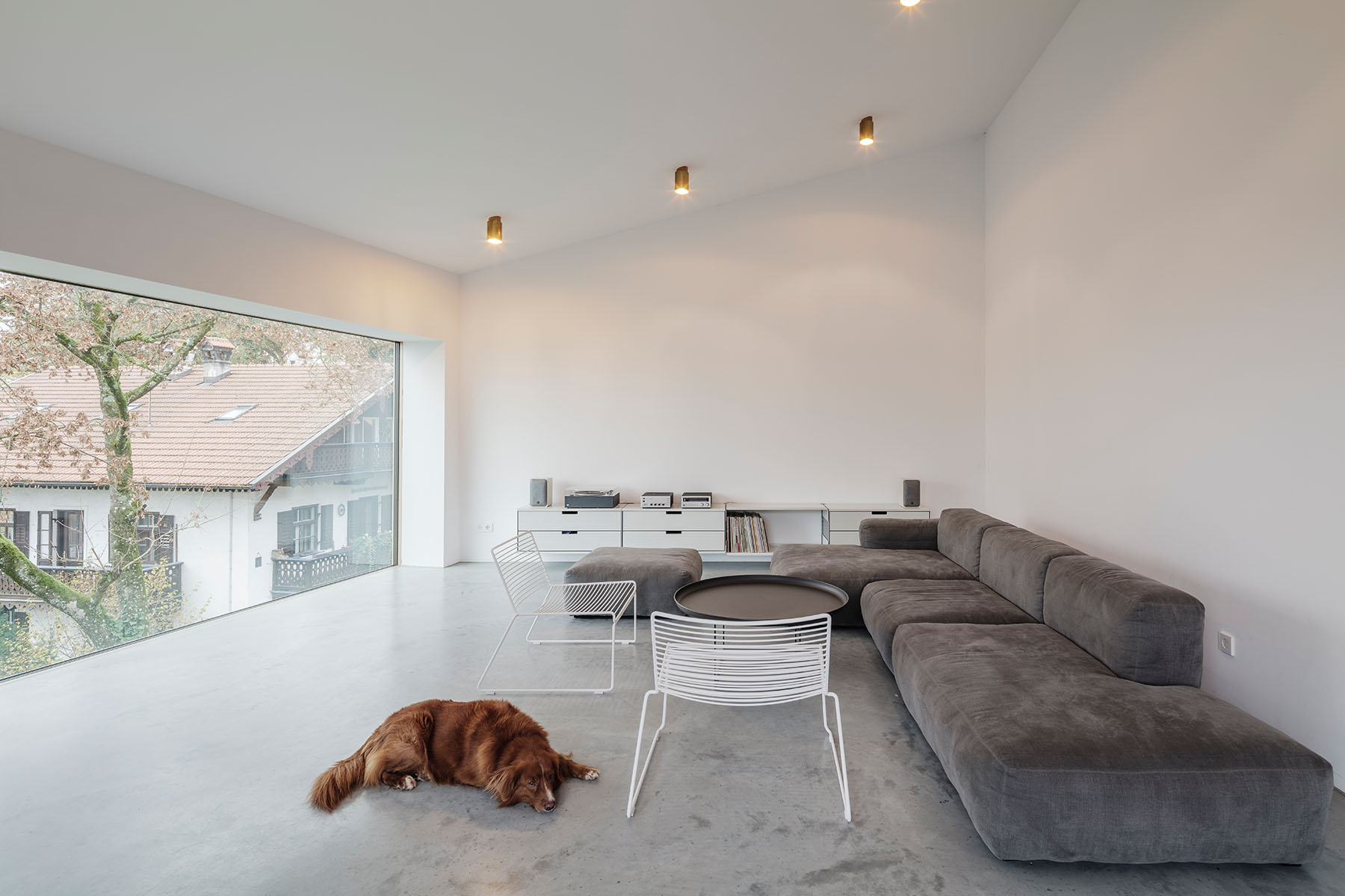 In Anlage an die beiden historischen Villen, wurde ein identischer Sockelputz verwendet. Materialien wie rohes Messing oder unbehandelte Eiche findet sich in vielen Details wieder. Große Fensterflächen setzen einen spannenden, modernen Kontrast und lassen viel Licht in Bereiche, die sonst oft im Dunkeln liegen, wie Entrée oder Treppenhaus. Daneben besticht es durch einen außergewöhnlichen 6-eckigen Grundriss. Ist man im Gebäude, so erlauben die Fenster einen großzügigen Blick nach draußen und vermitteln einem das Gefühl, Teil des Gartens zu sein.